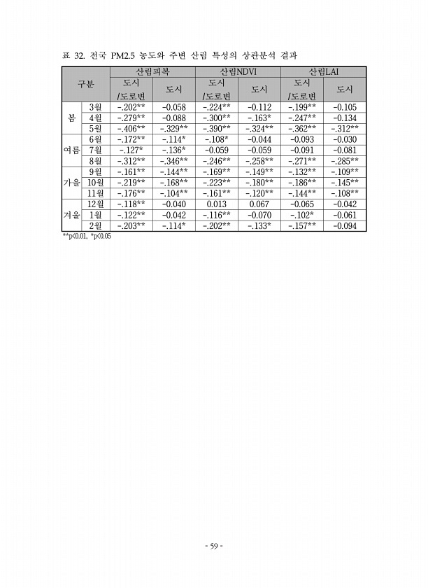 59 구분 산림피복 산림NDVI 산림LAI 도시 /도로변 도시 /도로변 도시 도시 /도로변 도시 도시 봄 3월 -.202** -0.058 -.224** -0.112 -.199** -0.105 4월 -.279** -0.088 -.300** -.163* -.247** -0.134 5월 -.406** -.329** -.390** -.324** -.362** -.312** 여름 6월 -.172** -.114* -.108* -0.044 -0.093 -0.030 7월 -.127* -.136* -0.059 -0.059 -0.091 -0.081 8월 -.312** -.346** -.246** -.258** -.271** -.285** 가을 9월 -.161** -.144** -.169** -.149** -.132** -.1...