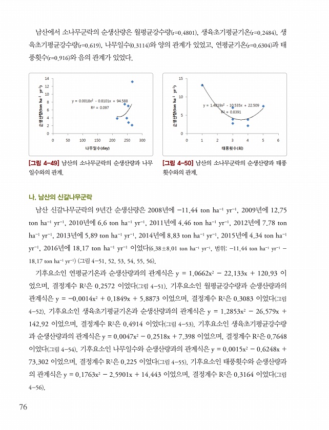 76 남산에서 소나무군락의 순생산량은 월평균강수량 r=0.4801 , 생육초기평균기온 r=0.2484 , 생 육초기평균강수량 r=0.619 , 나무일수 0.3114 와 양의 관계가 있었고, 연평균기온 r=0.6304 과 태 풍횟수 r=0.916 와 음의 관계가 있었다. [그림 4-49] 남산의 소나무군락의 순생산량과 나무 일수와의 관계. [그림 4-50] 남산의 소나무군락의 순생산량과 태풍 횟수와의 관계. 나. 남산의 신갈나무군락 남산 신갈나무군락의 9년간 순생산량은 2008년에 -11.44 ton ha-1 yr-1, 2009년에 12.75 ton ha-1 yr-1, 2010년에 6.6 ton ha-1 yr-1, 2011년에 4.46 ton ha-1 yr-1, 2012년에 7.78 ton ha-1 yr-1,...