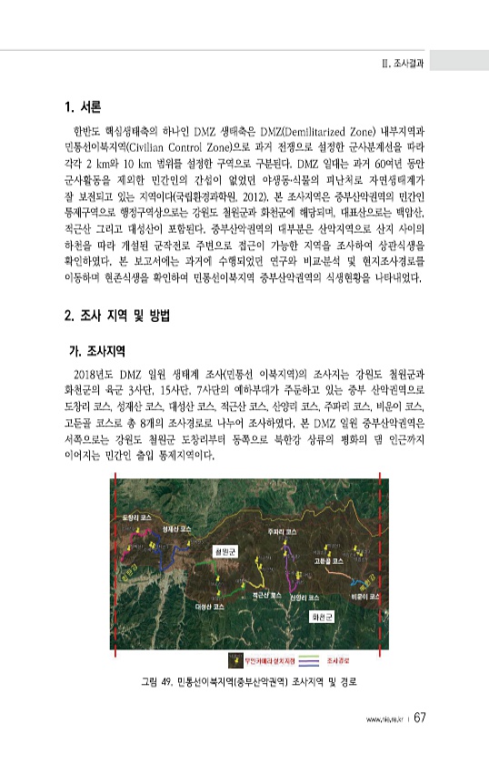 Ⅱ. 조사결과 www.nie.re.kr ? 67 1. 서론 한반도 핵심생태축의 하나인 DMZ 생태축은 DMZ Demilitarized Zone 내부지역과 민통선이북지역 Civilian Control Zone 으로 과거 전쟁으로 설정한 군사분계선을 따라 각각 2 km와 10 km 범위를 설정한 구역으로 구분된다. DMZ 일대는 과거 60여년 동안 군사활동을 제외한 민간인의 간섭이 없었던 야생동?식물의 피난처로 자연생태계가 잘 보전되고 있는 지역이다 국립환경과학원, 2012 본 조사지역은 중부산악권역의 민간인 통제구역으로 행정구역상으로는 강원도 철원군과 화천군에 해당되며, 대표산으로는 백암산, 적근산 그리고 대성산이 포함된다. 중부산악권역의 대부분은 산악지역으로 산지 사이의 하천을 따라 개설된 군작전로 주변으로...