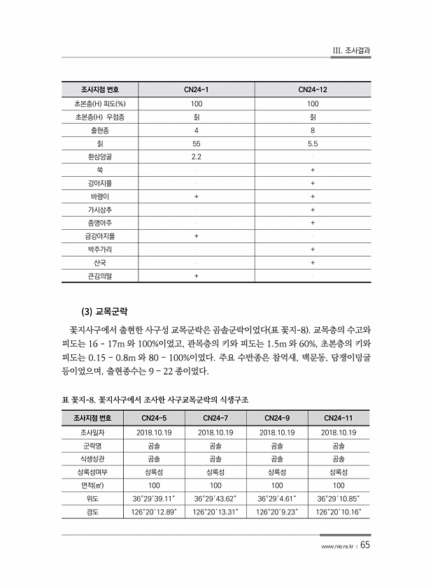 III. 조사결과 www.nie.re.kr ? 65 3 꽃지사구에서 출현한 사구성 교목군락은 곰솔군락이었다 표 꽃지-8 교목층의 수고와 피도는 16 17m 와 100%이었고, 관목층의 키와 피도는 1.5m 와 60%, 초본층의 키와 피도는 0.15 ? 0.8m 와 80 ? 100%이었다. 주요 수반종은 참억새, 맥문동, 담쟁이덩굴 등이었으며, 출현종수는 9 ? 22 종이었다. 조사지점 번호 CN24-5 CN24-7 CN24-9 CN24-11 조사일자 2018.10.19 2018.10.19 2018.10.19 2018.10.19 군락명 곰솔 곰솔 곰솔 곰솔 식생상관 곰솔 곰솔 곰솔 곰솔 상록성여부 상록성 상록성 상록성 상록성 면적 ㎡ 100 100 100 100 위도 36°29′39.11″ 36°29′43.6...