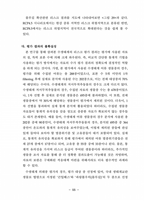 55 블루길 확산관련 리스크 결과를 지도에 나타내어보면 그림 29 과 같다. RCP4.5 시나리오에서는 한강 중류 지역만 리스크 위험지역으로 분류된 반면, RCP8.5에서는 리스크 위험지역이 전국적으로 확대된다는 것을 쉽게 볼 수 있다. 다. 평가 결과의 불확실성 본 연구를 통해 살펴본 수생태계의 리스크 평가 결과는 평가에 사용된 자료 의 질, 특히 표본 수에 의해 크게 좌우된다. 즉, 비교적 간단한 통계적 기법을 사용하는 평가 방식에서는 자료의 수가 평가 결과의 정확도에 결정적인 역할 을 하게 되는 것이다. 가령, 본 평가에서 사용된 수생태계 어류 생물종의 경우, 평가를 위해 수집된 어류는 총 288종이었으나, 표본 수 5개 미만의 1차 filtering 후에 실재로 분석에 사용된 수는 202종으로, 이는...