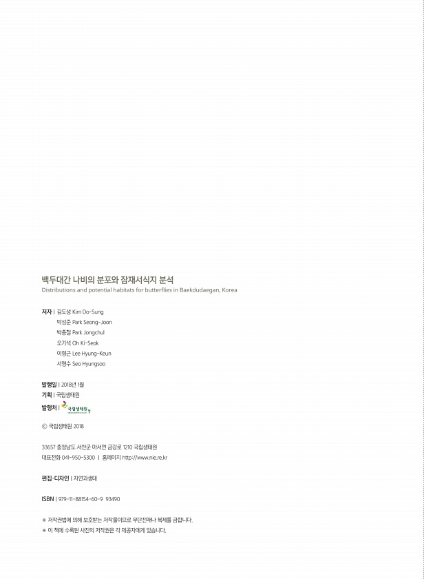 백두대간 나비의 분포와 잠재서식지 분석 Distributions and potential habitats for butterflies in Baekdudaegan, Korea 저자 | 김도성 Kim Do-Sung 박성준 Park Seong-Joon 박종철 Park Jongchul 오기석 Oh Ki-Seok 이형근 Lee Hyung-Keun 서형수 Seo Hyungsoo 발행일 | 2018년 1월 기획 | 국립생태원 발행처 | ⓒ 국립생태원 2018 33657 충청남도 서천군 마서면 금강로 1210 국립생태원 대표전화 041-950-5300 | 홈페이지 http//www.nie.re.kr 편집·디자인 | 자연과생태 ISBN | 979-11-88154-60-9 93490 ※ 저작권법에 의해 보호받는 저작물이므로...