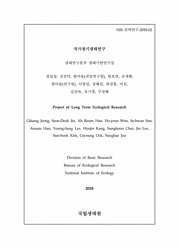 NIE-전략연구-2018-02 국가장기생태연구 생태연구본부 생태기반연구실 정길상, 진선덕, 한아름 전임연구원 , 원호연, 손세환, 한아름 연구원 , 이영상, 강혜진, 최성훈, 이진, 김선숙, 옥기영, 주성배 Project of Long Term Ecological Research Gilsang Jeong, Seon-Deok Jin, Ah Reum Han, Ho-yeon Won, Se-hwan Son, Areum Han, Young-Sang Lee, Hyejin Kang, Sunghoon Choi, Jin Lee, Sun-Sook Kim, Giyoung Ock, Sungbae Joo Division of Basic Research Bureau of Ecological Research National Insti...