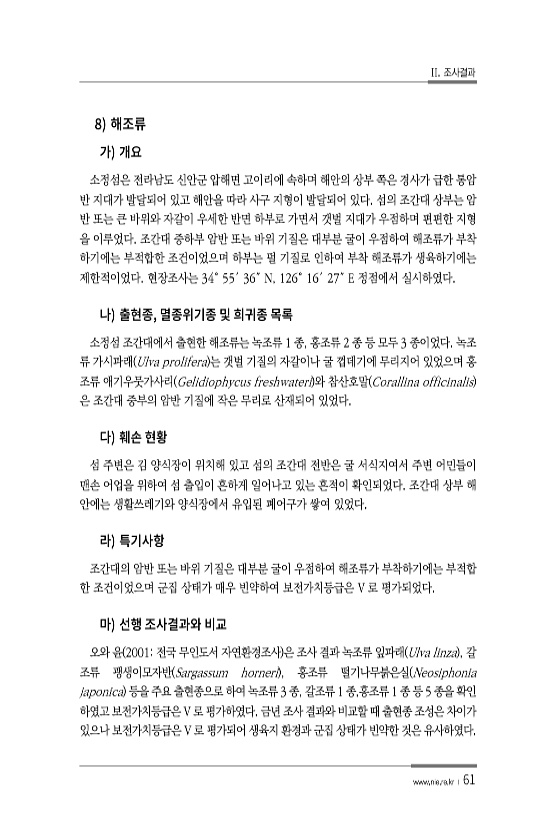 II. 조사결과 www.nie.re.kr ? 61 8 소정섬은 전라남도 신안군 압해면 고이리에 속하며 해안의 상부 쪽은 경사가 급한 통암 반 지대가 발달되어 있고 해안을 따라 사구 지형이 발달되어 있다. 섬의 조간대 상부는 암 반 또는 큰 바위와 자갈이 우세한 반면 하부로 가면서 갯벌 지대가 우점하며 편편한 지형 을 이루었다. 조간대 중하부 암반 또는 바위 기질은 대부분 굴이 우점하여 해조류가 부착 하기에는 부적합한 조건이었으며 하부는 펄 기질로 인하여 부착 해조류가 생육하기에는 제한적이었다. 현장조사는 34° 55′ 36″ N, 126° 16′ 27″ E 정점에서 실시하였다. , 소정섬 조간대에서 출현한 해조류는 녹조류 1 종, 홍조류 2 종 등 모두 3 종이었다. 녹조 류 가시파래 Ulva prolife...
