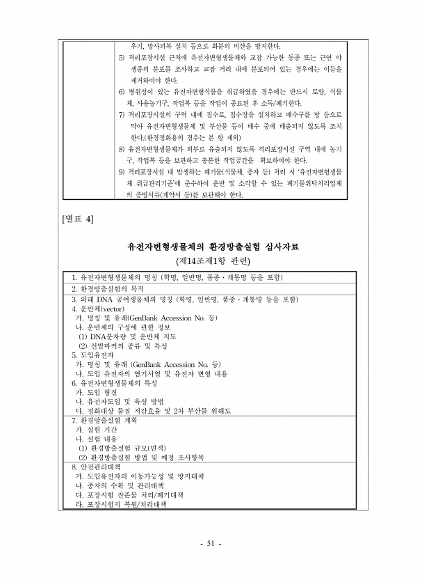51 [ 4] 14 1 우기, 망사피복 설치 등으로 화분의 비산을 방지한다. 5 격리포장시설 근처에 유전자변형생물체와 교잡 가능한 동종 또는 근연 야 생종의 분포를 조사하고 교잡 거리 내에 분포되어 있는 경우에는 이들을 제거하여야 한다. 6 병원성이 있는 유전자변형식물을 취급하였을 경우에는 반드시 토양, 식물 체, 사용농기구, 작업복 등을 작업이 종료된 후 소독/폐기한다. 7 격리포장시설의 구역 내에 집수로, 집수장을 설치하고 배수구를 망 등으로 막아 유전자변형생물체 및 부산물 등이 배수 중에 배출되지 않도록 조치 한다. 환경정화용의 경우는 본 항 제외 8 유전자변형생물체가 외부로 유출되지 않도록 격리포장시설 구역 내에 농기 구, 작업복 등을 보관하고 충분한 작업공간을 확보하여야 한다. 9 격리포장시설 내 ...