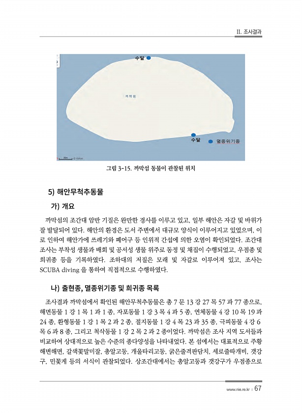 II. 조사결과 www.nie.re.kr ? 67 그림 3-15. 까막섬 동물이 관찰된 위치 5 까막섬의 조간대 암반 기질은 완만한 경사를 이루고 있고, 일부 해안은 자갈 및 바위가 잘 발달되어 있다. 해안의 환경은 도서 주변에서 대규모 양식이 이루어지고 있었으며, 이 로 인하여 해안가에 쓰레기와 폐어구 등 인위적 간섭에 의한 오염이 확인되었다. 조간대 조사는 부착성 생물과 배회 및 공서성 생물 위주로 동정 및 채집이 수행되었고, 우점종 및 희귀종 등을 기록하였다. 조하대의 저질은 모래 및 자갈로 이루어져 있고, 조사는 SCUBA diving 을 통하여 직접적으로 수행하였다. , 조사결과 까막섬에서 확인된 해안무척추동물은 총 7 문 13 강 27 목 57 과 77 종으로, 해면동물 1 강 1 목 1 과 1 ...
