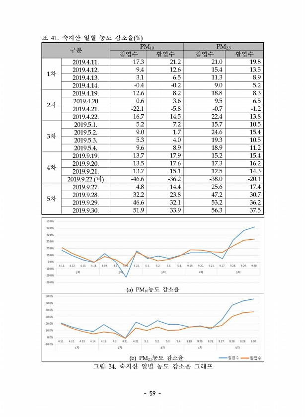 59 a PM10농도 감소율 F PM2.5농도 감소율 그림 34. 숙지산 일별 농도 감소율 그래프 구분 PM10 PM2.5 침엽수 활엽수 침엽수 활엽수 1차 2019.4.11. 17.3 21.2 21.0 19.8 2019.4.12. 9.4 12.6 15.4 13.5 2019.4.13. 3.1 6.5 11.3 8.9 2019.4.14. -0.4 -0.2 9.0 5.2 2차 2019.4.19. 12.6 8.2 18.8 8.3 2019.4.20 0.6 3.6 9.5 6.5 2019.4.21. -22.1 -5.8 -0.7 -1.2 2019.4.22. 16.7 14.5 22.4 13.8 3차 2019.5.1. 5.2 7.2 15.7 10.5 2019.5.2. 9.0 1.7 24.6 15.4 2019.5.3. 5.3 ...