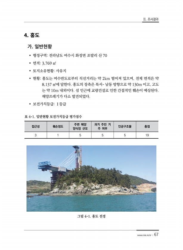 II. 조사결과 www.nie.re.kr ? 67 4. ? 행정구역전라남도 여수시 화정면 조발리 산 70 ? 면적3,769 ㎡ ? 토지소유현황사유지 ? 현황홍도는 여수반도로부터 직선거리는 약 2km 떨어져 있으며, 전제 면적은 약 8,137 ㎡에 달한다. 홍도의 장축은 북서- 남동 방향으로 약 130m 이고, 고도 는 약 10m 내외이다. 섬 인근에 교량건설로 인한 간접적인 훼손이 예상된다. 해양쓰레기가 다소 발견되었다. ? 보전가치등급Ⅰ등급 접근성 훼손정도 주변 해양 양식장 규모 과거 주민 거 주 여부 인공구조물 총점 3 1 5 5 5 19 표 4-1. 일반현황 보전가치등급 평가점수 그림 4-1. 홍도전경