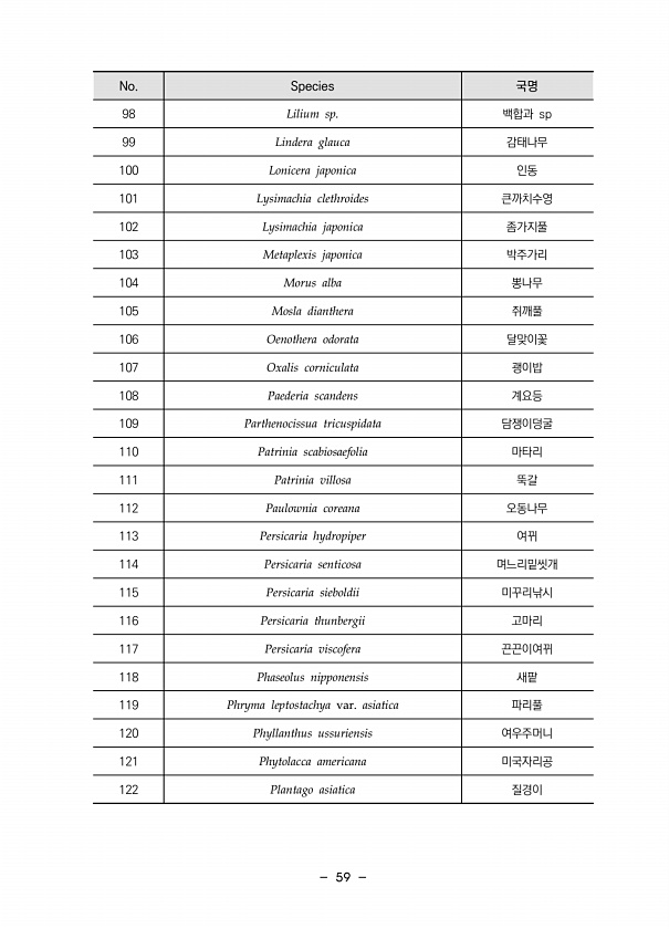 59 No. Species 국명 98 Lilium sp. 백합과 sp 99 Lindera glauca 감태나무 100 Lonicera japonica 인동 101 Lysimachia clethroides 큰까치수영 102 Lysimachia japonica 좀가지풀 103 Metaplexis japonica 박주가리 104 Morus alba 뽕나무 105 Mosla dianthera 쥐깨풀 106 Oenothera odorata 달맞이꽃 107 Oxalis corniculata 괭이밥 108 Paederia scandens 계요등 109 Parthenocissua tricuspidata 담쟁이덩굴 110 Patrinia scabiosaefolia 마타리 111 Patrinia villosa 뚝갈 112 P...