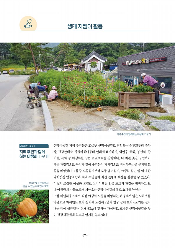 074 생태 지킴이 활동 산막이옛길 지역 주민들은 2019년 산막이옛길로 진입하는 수전교부터 주차 장, 관광안내소, 차돌바위나루터 일대에 해바라기, 백일홍, 국화, 봉선화, 할 미꽃, 목화 등 야생화를 심는 프로젝트를 진행했다. 다 자란 꽃을 구입하기 에는 재정적으로 무리가 있어 주민들이 자체적으로 비닐하우스를 설치해 모 종을 배양했다. 4월 중 모종심기부터 모종 옮겨심기, 야생화 심는 일 역시 산 막이옛길 영농조합과 지역 주민들이 직접 진행해 예산을 절감할 수 있었다. 이렇게 조성한 야생화 꽃길로 산막이옛길 인근 도로의 환경을 정비하고 보 다 아름답게 가꿈으로써 괴산호와 산막이옛길의 홍보 효과를 높였다. 또한 비닐하우스에서 직접 야생화 모종을 배양하는 과정에서 얻은 노하우를 바탕으로 자이언트 호박 심기에 ...