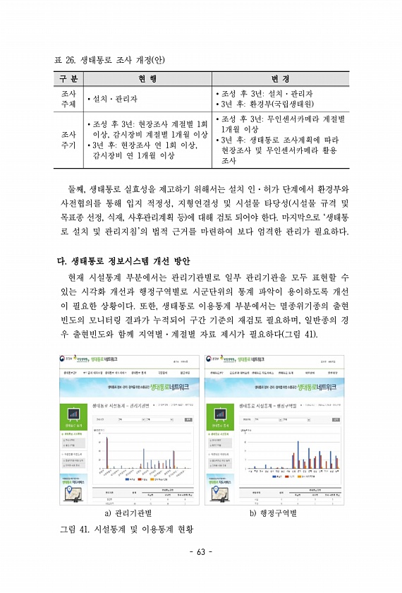 63 구 분 현 행 변 경 조사 주체 ? 설치·관리자 ? ? 조성 3년 후후환경부 3년설치 국립생태원 ·관리자 조사 주기 ? 조성 후 3년현장조사 계절별 1회 이상, 감시장비 계절별 1개월 이상 ? 3년 후현장조사 연 1회 이상, 감시장비 연 1개월 이상 ? 조성 후 3년무인센서카메라 계절별 1개월 이상 ? 3년 후생태통로 조사계획에 따라 현장조사 및 무인센서카메라 활용 조사 표 26. 생태통로 조사 개정 안 둘째, 생태통로 실효성을 제고하기 위해서는 설치 인·허가 단계에서 환경부와 사전협의를 통해 입지 적정성, 지형연결성 및 시설물 타당성 시설물 규격 및 목표종 선정, 식재, 사후관리계획 등 에 대해 검토 되어야 한다. 마지막으로 `생태통 로 설치 및 관리지침의 법적 근거를 마련하여 보다 엄격한 관리가 필...