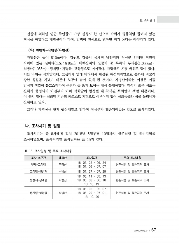 Ⅱ. 조사결과 www.nie.re.kr ? 67 전설에 의하면 인근 주민들이 가장 신성시 한 산으로 바위가 병풍처럼 둘러져 있는 형상을 하였다고 괘병산이라 하며, 암벽이 흰색으로 변하면 비가 온다는 이야기가 있다. 다 원방재삽당령 자병산 자병산은 높이 810m이다. 강원도 강릉시 옥계면 남양리와 정선군 임계면 직원리 사이에 있는 산이다 고도:810m 태백산지의 산줄기 중 북쪽의 두리봉 1,033m · 석병산 1,055m · 생계령 · 자병산 · 백봉령으로 이어진다. 자병산은 온통 바위로 덮여 있다. 이들 바위는 석회암인데, 고생대에 열대 바다에서 형성된 해성퇴적암으로 풍화에 비교적 강한 성질을 지녔기 때문에 노두에 남아 있게 된 것이다. 자병산이라는 이름은 이들 암석의 색깔이 불그스레하여 주위가 늘 붉게 보...