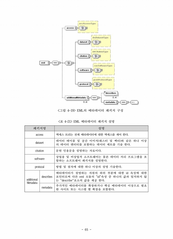 65 그림 4-19 EML의 메타데이터 패키지 구성 패키지명 설명 access 액세스 트리는 전체 메타데이터에 대한 액세스를 제어 한다. dataset 데이터 테이블 및 공간 이미지 래스터 및 벡터 와 같은 하나 이상 의 데이터 엔터티를 포함하는 데이터 세트를 기술 한다. citation 문헌 인용문을 설명하는 자료이다. software 상업용 및 비상업적 소프트웨어는 물론 데이터 처리 프로그램을 포 함하는 소프트웨어 패키지를 설명한다. protocal 방법 및 절차에 대한 하나 이상의 설명 기술한다. additional Metadata describes 메타데이터가 설명하는 자원의 하위 부분에 대한 id 속성에 대한 포인터로써 다른 eml 모듈의 id속성 중 하나의 값과 일치하지 않 는 describe요소...