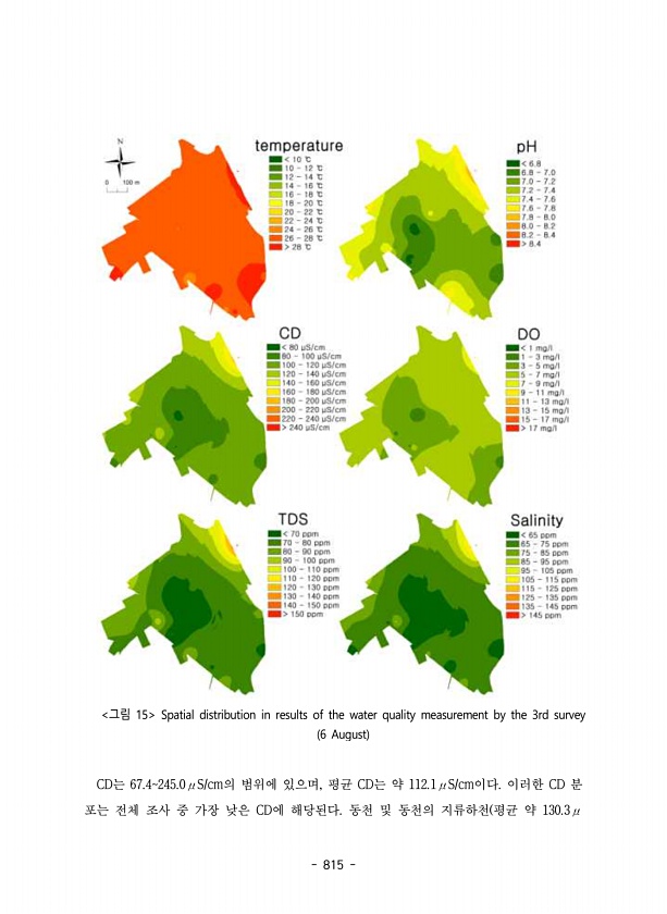 815 그림 15 Spatial distribution in results of the water quality measurement by the 3rd survey 6 August CD는 67.4245.0μS/cm의 범위에 있으며, 평균 CD는 약 112.1μS/cm이다. 이러한 CD 분 포는 전체 조사 중 가장 낮은 CD에 해당된다. 동천 및 동천의 지류하천 평균 약130.3μ