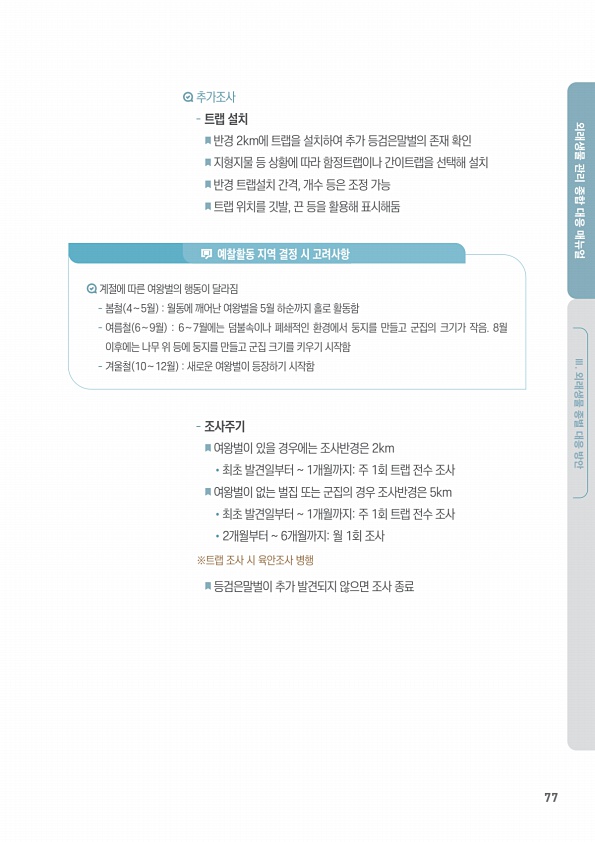 77 외래생물 관리 종합 대응 매뉴얼 Ⅲ. 외래생물 종별 대응 방안 추가조사 트랩 설치 반경 2km에 트랩을 설치하여 추가 등검은말벌의 존재 확인 지형지물 등 상황에 따라 함정트랩이나 간이트랩을 선택해 설치 반경 트랩설치 간격, 개수 등은 조정 가능 트랩 위치를 깃발, 끈 등을 활용해 표시해둠 조사주기 여왕벌이 있을 경우에는 조사반경은 2km ?최초 발견일부터 1개월까지주 1회 트랩 전수 조사 여왕벌이 없는 벌집 또는 군집의 경우 조사반경은 5km ?최초 발견일부터 1개월까지주 1회 트랩 전수 조사 ?2개월부터 6개월까지월 1회 조사 ※트랩 조사 시 육안조사 병행 등검은말벌이 추가 발견되지 않으면 조사 종료 계절에 따른 여왕벌의 행동이 달라짐 봄철 4∼5월 월동에 깨어난 여왕벌을 5월 하순까지 홀로 활동함 ...