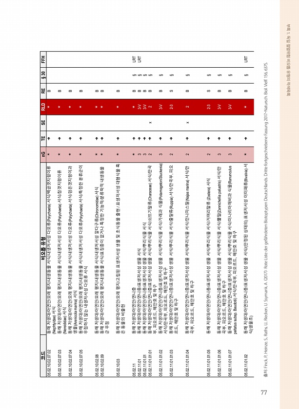 부록 1. 독일 절멸위험 비오톱 유형의 적색목록 출처Finck, P., Heinze, S., Raths, U., Riecken, U. Ssymank, A. 2017 Rote Liste der gef?hrdeten Biotoptypen Deutschlands. Dritte fortgeschriebene Fassung 2017.-Natursch. Biol. Vielf. 156, 637S. 코드 비오톱 유형 nG TE SE RLD RE § 30 FFH 05.02.10.02.07.02 동해 저생대/아연안/모래 평지/내생동물 서식/내생저서성 다모류 Polychaeta 서식/백금갯지렁이류 Nephtyidae 서식 ? ? ? B 05.02.10.02.07.03 동해 저생대/아연안/모래 평지/내생동물 서식/내생저서성 다모...