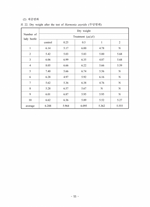 55 2 22. Dry weight after the test of Harmonia axyridis Number of lady beetle Dry weight Treatment ㎍/㎕ control 0.25 0.5 1 2 1 6.14 5.17 6.00 4.78 N 2 5.42 5.03 5.83 5.00 5.68 3 6.06 6.99 6.35 4.87 5.68 4 8.05 6.66 6.22 5.66 5.59 5 7.40 5.66 6.74 5.56 N 6 6.28 4.97 5.92 6.16 N 7 5.62 5.36 6.38 4.76 N 8 5.28 6.57 5.67 N N 9 6.01 6.87 5.95 5.95 N 10 6.62 6.36 5.89 5.52 5.27 average 6.288 5.964 6.095 ...