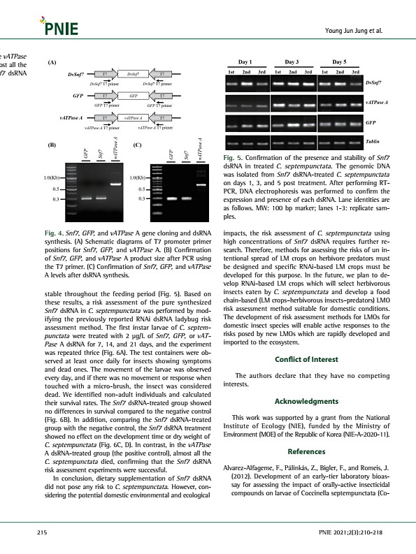 ontrast, in the vATPase , almost all the f7 dsRNA stable throughout the feeding period Fig. 5 Based on these results, a risk assessment of the pure synthesized Snf7 dsRNA in C. septempunctata was performed by modifying the previously reported RNAi dsRNA ladybug risk assessment method. The first instar larvae of C. septempunctata were treated with 2 ?g/L of Snf7, GFP, or vATPase A dsRNA for 7, 14, ...