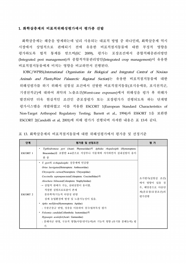 단계 평가종 및 선정조건 평 가 ESCORT 1 ? Typhlodromeus pyri AcariPhytoseiidae 와 Aphidus rhopalosiphi HymenopteraBraconidae 를 포함한 46종으로 지상부나 식물체에 서식하면서 실내실험이 용이 한 종 초기평가 실험실 조건 에서 영향이 있을 경 우, 해당종으로 다음단 계 준포장/포장조건 의 ESCORT 2 평가진행 ? T. pyri와 A.rhopalosiphi살충제에 민감함 Orius laevigatus HeteropteraAnthocoridae Chrysoperla carnea NeuropteraChrysopidae Coccinella septempunctata ColeopteraCoccinellidae 와 Aleochara biline...