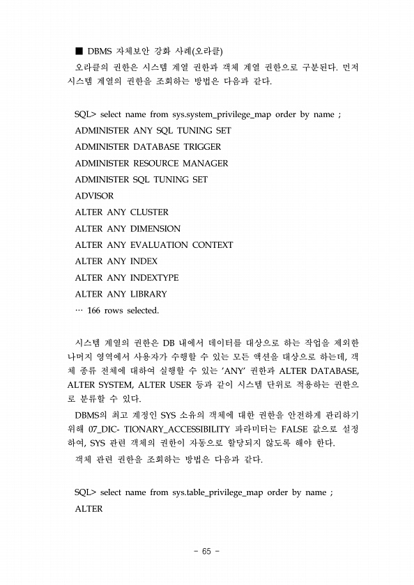 ■ DBMS 자체보안 강화 사례 오라클 오라클의 권한은 시스템 계열 권한과 객체 계열 권한으로 구분된다. 먼저 시스템 계열의 권한을 조회하는 방법은 다음과 같다. SQL select name from sys.system_privilege_map order by name ; ADMINISTER ANY SQL TUNING SET ADMINISTER DATABASE TRIGGER ADMINISTER RESOURCE MANAGER ADMINISTER SQL TUNING SET ADVISOR ALTER ANY CLUSTER ALTER ANY DIMENSION ALTER ANY EVALUATION CONTEXT ALTER ANY INDEX ALTER ANY INDEXTYPE ALTER ANY LIBRARY … 166 ...