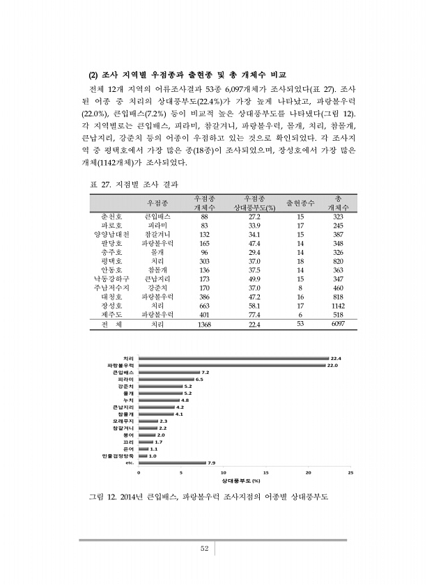 52 2 조사 지역별 우점종과 출현종 및 총 개체수 비교 전체 12개 지역의 어류조사결과 53종 6,097개체가 조사되었다 표 27 조사 된 어종 중 치리의 상대풍부도 22.4% 가 가장 높게 나타났고, 파랑볼우럭 22.0% , 큰입배스 7.2% 등이 비교적 높은 상대풍부도를 나타냈다 그림 12 각 지역별로는 큰입배스, 피라미, 참갈겨니, 파랑볼우럭, 몰개, 치리, 참몰개, 큰납지리, 강준치 등의 어종이 우점하고 있는 것으로 확인되었다. 각 조사지 역 중 평택호에서 가장 많은 종 18종 이 조사되었으며, 장성호에서 가장 많은 개체 1142개체 가 조사되었다. 우점종 우점종 개체수 우점종 상대풍부도 % 출현종수 개체수 총 춘천호 큰입배스 88 27.2 15 323 파로호 피라미 83 33.9 17 245 양양...