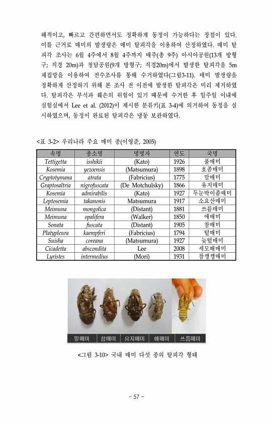 해적이고, 빠르고 간편하면서도 정확하게 동정이 가능하다는 장점이 있다. 이를 근거로 매미의 발생량은 매미 탈피각을 이용하여 산정하였다. 매미 탈 피각 조사는 6월 4주에서 8월 4주까지 매주 총 9주 아시아공원 13개 방형 구; 직경 20m 과 청담공원 9개 방형구; 직경20m 에서 발생한 탈피각을 5m 채집망을 이용하여 전수조사를 통해 수거하였다 그림3-11 매미 발생량을 정확하게 산정하기 위해 본 조사 전 이전에 발생한 탈피각은 미리 제거하였 다. 탈피각은 부식과 훼손의 위험이 있기 때문에 수거한 후 일주일 이내에 실험실에서 Lee et al. 2012 이 제시한 분류키 표 3-4 에 의거하여 동정을 실 시하였으며, 동정이 완료된 탈피각은 냉동 보관하였다. 속명 종소명 명명자 연도 국명 Tettigett...