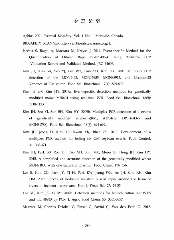 59 참 고 문 헌 Agbios 2001. Esential Biosafety. Vol. 1 No. 1 Merkvile, Canada. BIOSAFETY SCANNER http//en.biosafetyscanner.org/ Jacchia S, Bogni A, Mazzara M, Kreysa J. 2014. Event-specific Method for the Quantification of Oilseed Rape DP-073496-4 Using Real-time PCR -Validation Report and Validated Method. JRC 94606. Kim JH, Kim SA, Seo YJ, Lee WY, Park SH, Kim HY. 2008. Multiplex PCR detection of th...