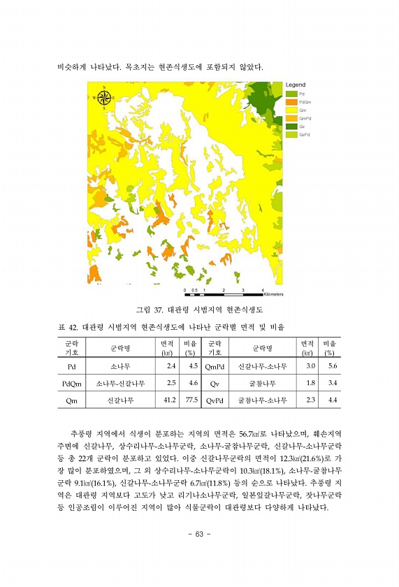 63 비슷하게 나타났다. 목초지는 현존식생도에 포함되지 않았다. 그림 37. 대관령 시범지역 현존식생도 군락 기호 군락명 면적 ㎢ 비율 % 군락 기호 군락명 면적 ㎢ 비율 % Pd 소나무 2.4 4.5 QmPd 신갈나무-소나무 3.0 5.6 PdQm 소나무-신갈나무 2.5 4.6 Qv 굴참나무 1.8 3.4 Qm 신갈나무 41.2 77.5 QvPd 굴참나무-소나무 2.3 4.4 표 42. 대관령 시범지역 현존식생도에 나타난 군락별 면적 및 비율 추풍령 지역에서 식생이 분포하는 지역의 면적은 56.7㎢로 나타났으며, 훼손지역 주변에 신갈나무, 상수리나무-소나무군락, 소나무-굴참나무군락, 신갈나무-소나무군락 등 총 22개 군락이 분포하고 있었다. 이중 신갈나무군락의 면적이 12.3㎢ 21.6% 로 가 장 많이 ...