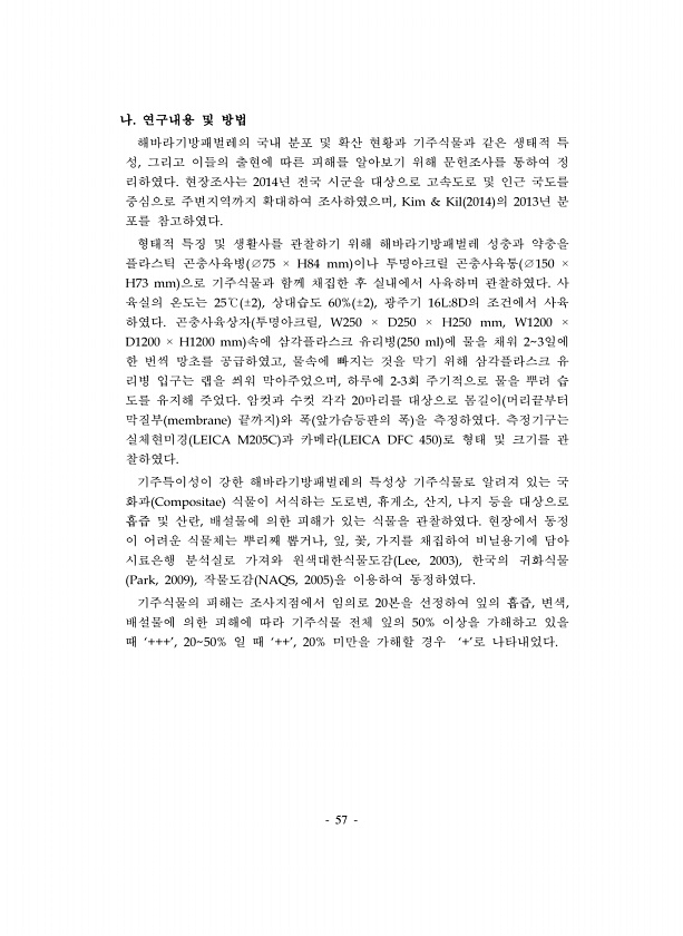57 나. 연구내용 및 방법 해바라기방패벌레의 국내 분포 및 확산 현황과 기주식물과 같은 생태적 특 성, 그리고 이들의 출현에 따른 피해를 알아보기 위해 문헌조사를 통하여 정 리하였다. 현장조사는 2014년 전국 시군을 대상으로 고속도로 및 인근 국도를 중심으로 주변지역까지 확대하여 조사하였으며, Kim & Kil 2014 의 2013년 분 포를 참고하였다. 형태적 특징 및 생활사를 관찰하기 위해 해바라기방패벌레 성충과 약충을 플라스틱 곤충사육병 ?75 × H84 mm 이나 투명아크릴 곤충사육통 ?150 × H73 mm 으로 기주식물과 함께 채집한 후 실내에서 사육하며 관찰하였다. 사 육실의 온도는 25℃ ±2 , 상대습도 60% ±2 , 광주기 16L8D의 조건에서 사육 하였다. 곤충사육상자 투명아크릴, ...