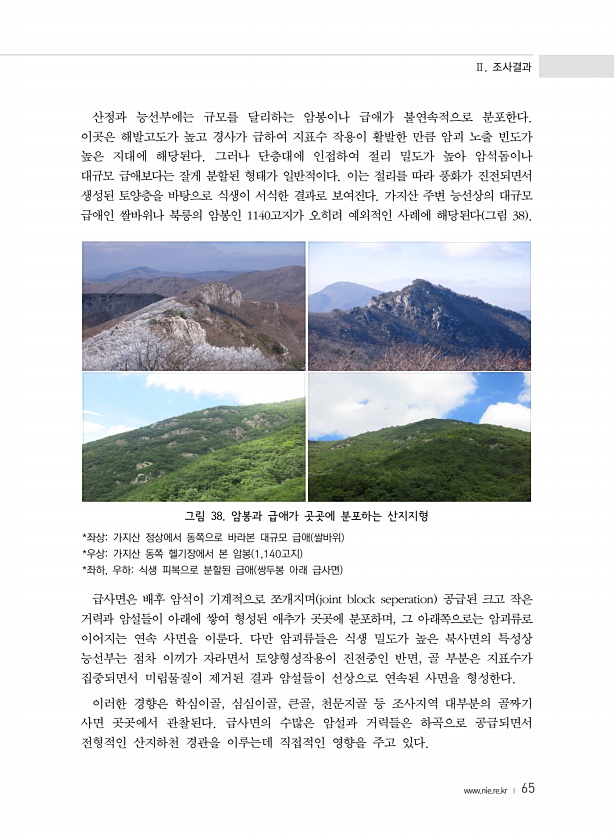 Ⅱ. 조사결과 www.nie.re.kr ? 65 산정과 능선부에는 규모를 달리하는 암봉이나 급애가 불연속적으로 분포한다. 이곳은 해발고도가 높고 경사가 급하여 지표수 작용이 활발한 만큼 암괴 노출 빈도가 높은 지대에 해당된다. 그러나 단층대에 인접하여 절리 밀도가 높아 암석돔이나 대규모 급애보다는 잘게 분할된 형태가 일반적이다. 이는 절리를 따라 풍화가 진전되면서 생성된 토양층을 바탕으로 식생이 서식한 결과로 보여진다. 가지산 주변 능선상의 대규모 급애인 쌀바위나 북릉의 암봉인 1140고지가 오히려 예외적인 사례에 해당된다 그림 38 그림 38. 암봉과 급애가 곳곳에 분포하는 산지지형 *좌상가지산 정상에서 동쪽으로 바라본 대규모 급애 쌀바위 *우상가지산 동쪽 헬기장에서 본 암봉 1,140고지 *좌하, 우하식...