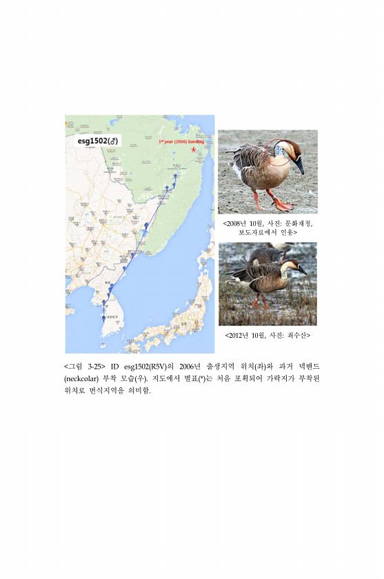 2008년 10월, 사진문화재청, 보도자료에서 인용 2012년 10월, 사진최수산 그림 3-25 ID esg1502 R5V 의 2006년 출생지역 위치 좌 와 과거 넥밴드 neckcolar 부착 모습 우 지도에서 별표 * 는 처음 포획되어 가락지가 부착된 위치로 번식지역을의미함.