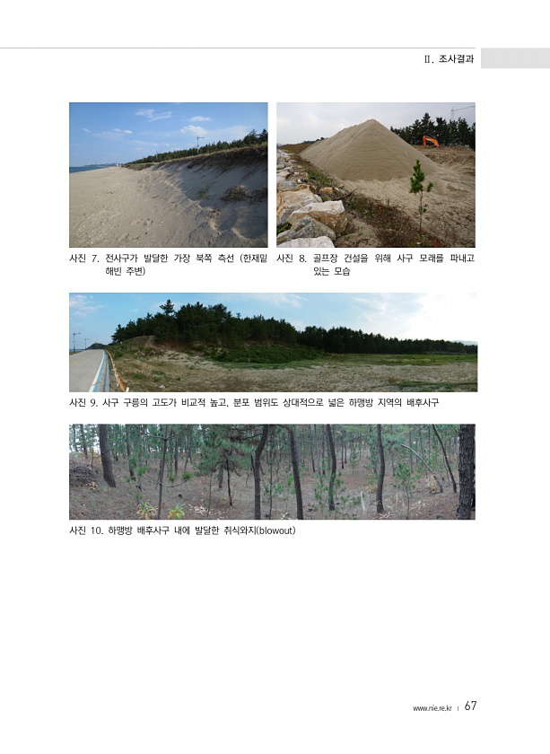 Ⅱ. 조사결과 www.nie.re.kr ? 67 사진 7. 전사구가 발달한 가장 북쪽 측선 한재밑 해빈 주변 사진 8. 골프장 건설을 위해 사구 모래를 파내고 있는 모습 사진 9. 사구 구릉의 고도가 비교적 높고, 분포 범위도 상대적으로 넓은 하맹방 지역의 배후사구 사진 10. 하맹방 배후사구 내에 발달한 취식와지 blowout