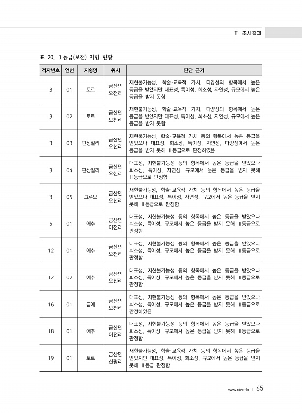 Ⅱ. 조사결과 www.nie.re.kr ? 65 격자번호 연번 지형명 위치 판단 근거 3 01 토르 금산면 오천리 재현불가능성, 학술·교육적 가치, 다양성의 항목에서 높은 등급을 받았지만 대표성, 특이성, 희소성, 자연성, 규모에서 높은 등급을 받지 못함 3 02 토르 금산면 오천리 재현불가능성, 학술·교육적 가치, 다양성의 항목에서 높은 등급을 받았지만 대표성, 특이성, 희소성, 자연성, 규모에서 높은 등급을 받지 못함 3 03 판상절리 금산면 오천리 재현불가능성, 학술·교육적 가치 등의 항목에서 높은 등급을 받았으나 대표성, 희소성, 특이성, 자연성, 다양성에서 높은 등급을 받지 못해 Ⅱ등급으로 판정하였음 3 04 판상절리 금산면 오천리 대표성, 재현불가능성 등의 항목에서 높은 등급을 받았으나 희소성, ...
