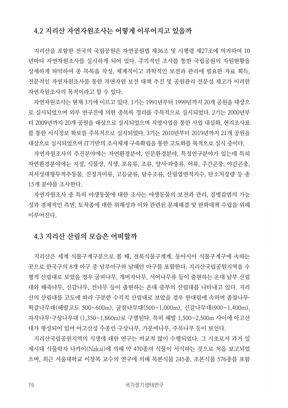 76 국가장기생태연구 4.2 지리산 자연자원조사는 어떻게 이루어지고 있을까 지리산을 포함한 전국의 국립공원은 자연공원법 제36조 및 시행령 제27조에 의거하여 10 년마다 자연자원조사를 실시하게 되어 있다. 주기적인 조사를 통한 국립공원의 자원현황을 상세하게 파악하여 종 목록을 작성, 체계적이고 과학적인 보전과 관리에 필요한 자료 획득, 전문적인 자연자원조사를 통한 자연자원 보전 대책 추진 및 공원관리 전문성 제고가 이러한 자연자원조사의 목적이라고 할 수 있다. 자연자원조사는 현재 3기에 이르고 있다. 1기는 1991년부터 1999년까지 20개 공원을 대상으 로 실시되었으며 외부 연구진에 의한 종목록 정리를 주목적으로 실시되었다. 2기는 2000년부 터 2009년까지 20개 공원을 대상으로 실시되었으며 직영...