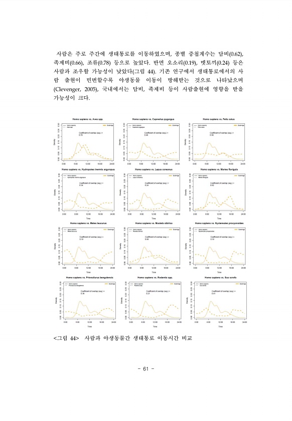 61 사람은 주로 주간에 생태통로를 이동하였으며, 종별 중첩계수는 담비 0.62 , 족제비 0.66 , 조류 0.78 등으로 높았다. 반면 오소리 0.19 , 멧토끼 0.24 등은 사람과 조우할 가능성이 낮았다 그림 44 기존 연구에서 생태통로에서의 사 람 출현이 빈번할수록 야생동물 이동이 방해받는 것으로 나타났으며 Clevenger, 2005 , 국내에서는 담비, 족제비 등이 사람출현에 영향을 받을 가능성이 크다. 그림 44 사람과 야생동물간 생태통로 이동시간비교