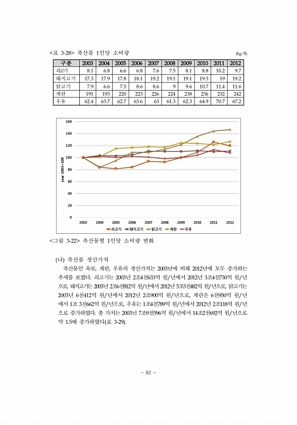 62 표 3-28 축산물 1인당 소비량 kg,개 구분 2003 2004 2005 2006 2007 2008 2009 2010 2011 2012 쇠고기 8.1 6.8 6.6 6.8 7.6 7.5 8.1 8.8 10.2 9.7 돼지고기 17.3 17.9 17.8 18.1 19.2 19.1 19.1 19.3 19 19.2 닭고기 7.9 6.6 7.5 8.6 8.6 9 9.6 10.7 11.4 11.6 계란 191 193 220 223 226 224 238 236 232 242 우유 62.4 63.7 62.7 63.6 63 61.3 62.3 64.9 70.7 67.2 그림 3-22 축산물별 1인당 소비량 변화 나 축산물 생산가치 축산물인 육류, 계란, 우유의 생산가치는 2003년에 비해 2012년에 모두 증가하는 ...