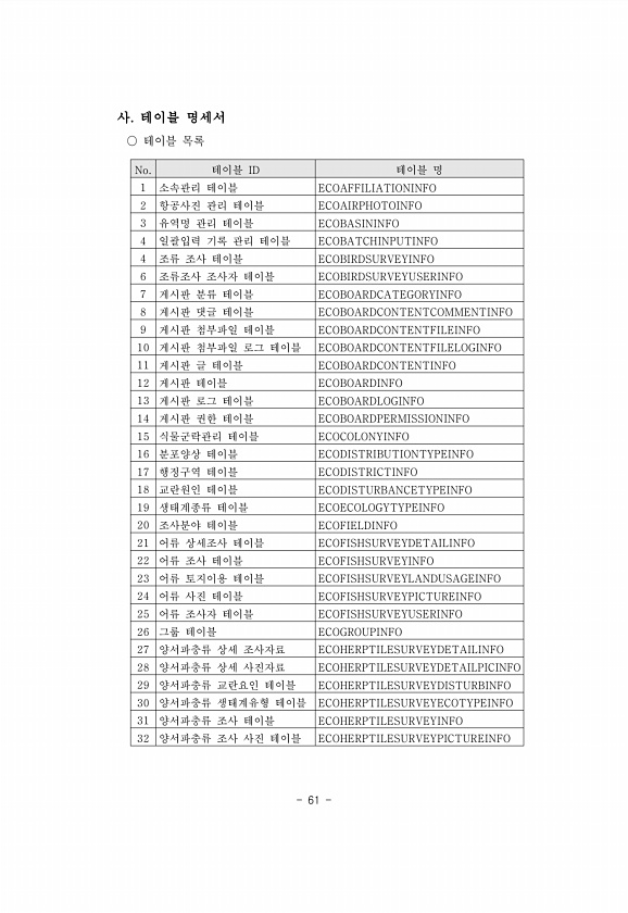 61 No. 테이블 ID 테이블 명 1 소속관리 테이블 ECOAFFILIATIONINFO 2 항공사진 관리 테이블 ECOAIRPHOTOINFO 3 유역명 관리 테이블 ECOBASININFO 4 일괄입력 기록 관리 테이블 ECOBATCHINPUTINFO 4 조류 조사 테이블 ECOBIRDSURVEYINFO 6 조류조사 조사자 테이블 ECOBIRDSURVEYUSERINFO 7 게시판 분류 테이블 ECOBOARDCATEGORYINFO 8 게시판 댓글 테이블 ECOBOARDCONTENTCOMMENTINFO 9 게시판 첨부파일 테이블 ECOBOARDCONTENTFILEINFO 10 게시판 첨부파일 로그 테이블 ECOBOARDCONTENTFILELOGINFO 11 게시판 글 테이블 ECOBOARDCONTENTINFO ...