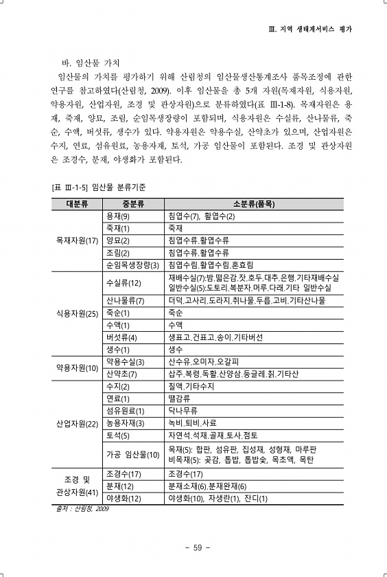 Ⅲ. 지역 생태계서비스 평가 59 바. 임산물 가치 임산물의 가치를 평가하기 위해 산림청의 임산물생산통계조사 품목조정에 관한 연구를 참고하였다 산림청, 2009 이후 임산물을 총 5개 자원 목재자원, 식용자원, 약용자원, 산업자원, 조경 및 관상자원 으로 분류하였다 표 Ⅲ-1-8 목재자원은 용 재, 죽재, 양묘, 조림, 순임목생장량이 포함되며, 식용자원은 수실류, 산나물류, 죽 순, 수액, 버섯류, 생수가 있다. 약용자원은 약용수실, 산약초가 있으며, 산업자원은 수지, 연료, 섬유원료, 농용자재, 토석, 가공 임산물이 포함된다. 조경 및 관상자원 은 조경수, 분재, 야생화가 포함된다. 대분류 중분류 소분류 품목 목재자원 17 용재 9 침엽수 7 , 활엽수 2 죽재 1 죽재 양묘 2 침엽수류?활엽수류 조림 2...