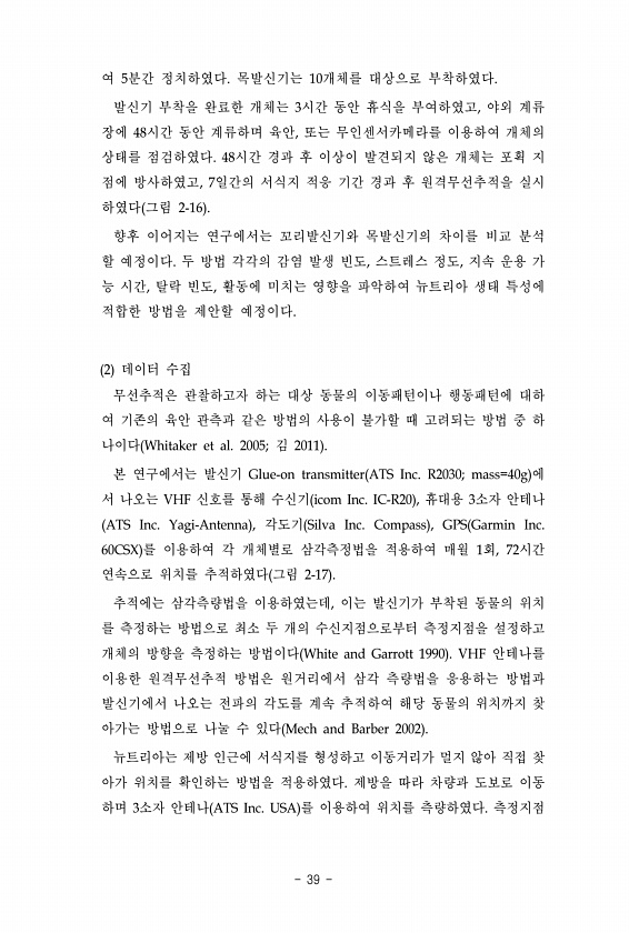 여 5분간 정치하였다. 목발신기는 10개체를 대상으로 부착하였다. 발신기 부착을 완료한 개체는 3시간 동안 휴식을 부여하였고, 야외 계류 장에 48시간 동안 계류하며 육안, 또는 무인센서카메라를 이용하여 개체의 상태를 점검하였다. 48시간 경과 후 이상이 발견되지 않은 개체는 포획 지 점에 방사하였고, 7일간의 서식지 적응 기간 경과 후 원격무선추적을 실시 하였다 그림 2-16 향후 이어지는 연구에서는 꼬리발신기와 목발신기의 차이를 비교 분석 할 예정이다. 두 방법 각각의 감염 발생 빈도, 스트레스 정도, 지속 운용 가 능 시간, 탈락 빈도, 활동에 미치는 영향을 파악하여 뉴트리아 생태 특성에 적합한 방법을 제안할 예정이다. 2 데이터 수집 무선추적은 관찰하고자 하는 대상 동물의 이동패턴이나 행동패턴에 대하...