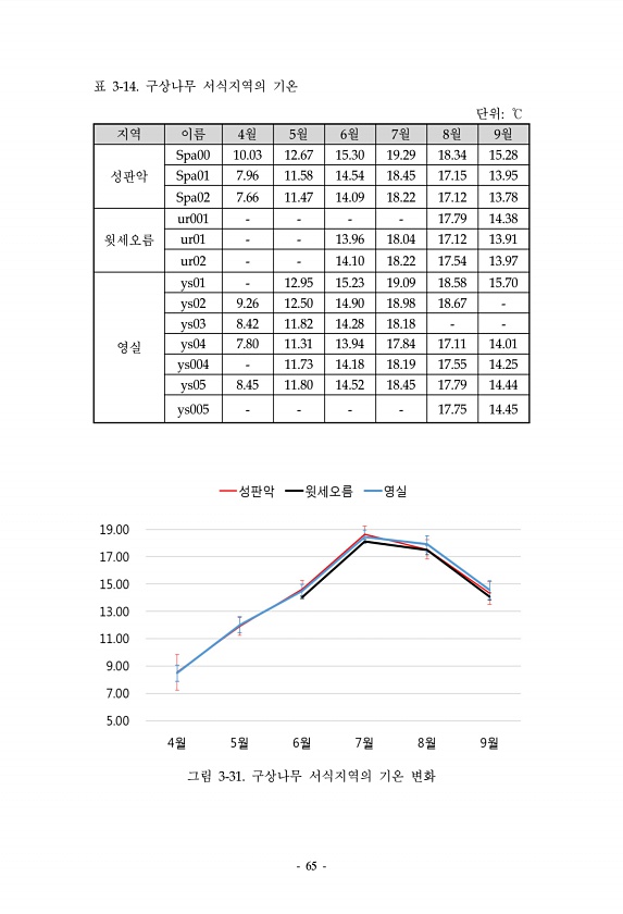 65 단위℃ 지역 이름 4월 5월 6월 7월 8월 9월 성판악 Spa00 10.03 12.67 15.30 19.29 18.34 15.28 Spa01 7.96 11.58 14.54 18.45 17.15 13.95 Spa02 7.66 11.47 14.09 18.22 17.12 13.78 윗세오름 ur001 17.79 14.38 ur01 13.96 18.04 17.12 13.91 ur02 14.10 18.22 17.54 13.97 영실 ys01 12.95 15.23 19.09 18.58 15.70 ys02 9.26 12.50 14.90 18.98 18.67 ys03 8.42 11.82 14.28 18.18 ys04 7.80 11.31 13.94 17.84 17.11 14.01 ys004 11.73 14.18 18...