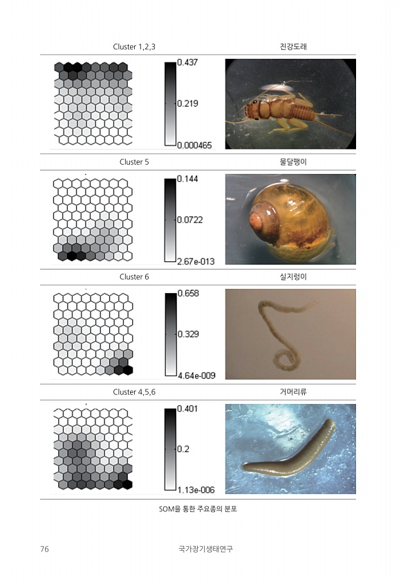 76 국가장기생태연구 Cluster 1,2,3 진강도래 Cluster 5 물달팽이 Cluster 6 실지렁이 Cluster 4,5,6 거머리류 SOM을 통한 주요종의분포