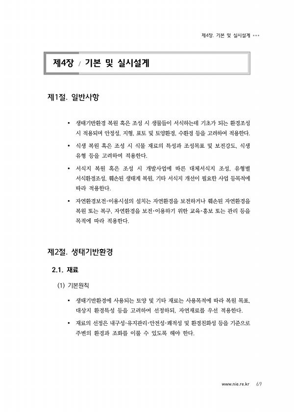 www.nie.re.kr 69 제4장. 기본 및 실시설계 제4장 기본 및 실시설계 제1절. 일반사항 생태기반환경 복원 혹은 조성 시 생물들이 서식하는데 기초가 되는 환경조성 시 적용되며 안정성, 지형, 표토 및 토양환경, 수환경 등을 고려하여 적용한다. 식생 복원 혹은 조성 시 식물 재료의 특성과 조성목표 및 보전강도, 식생 유형 등을 고려하여 적용한다. 서식지 복원 혹은 조성 시 개발사업에 따른 대체서식지 조성, 유형별 서식환경조성, 훼손된 생태계 복원, 기타 서식지 개선이 필요한 사업 등목적에 따라 적용한다. 자연환경보전?이용시설의 설치는 자연환경을 보전하거나 훼손된 자연환경을 복원 또는 복구, 자연환경을 보전?이용하기 위한 교육?홍보 또는 관리 등을 목적에 따라 적용한다. 제2절. 생태기반환경 2.1....