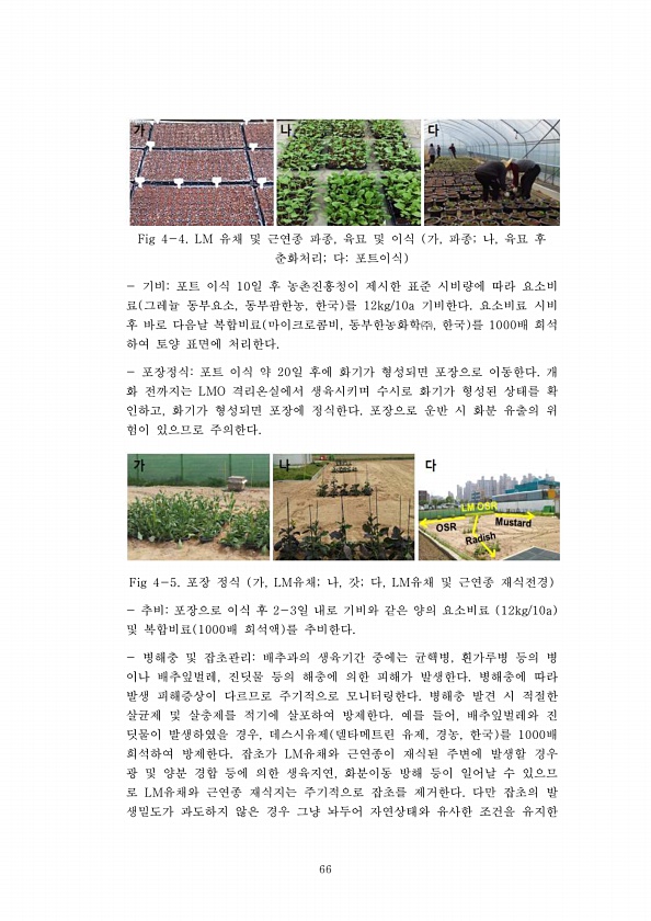 66 Fig 4-4. LM 유채 및 근연종 파종, 육묘 및 이식 가, 파종; 나, 육묘 후 춘화처리; 다포트이식 기비포트 이식 10일 후 농촌진흥청이 제시한 표준 시비량에 따라 요소비 료 그레뉼 동부요소, 동부팜한농, 한국 를 12kg/10a 기비한다. 요소비료 시비 후 바로 다음날 복합비료 마이크로콤비, 동부한농화학㈜, 한국 를 1000배 희석 하여 토양 표면에 처리한다. 포장정식포트 이식 약 20일 후에 화기가 형성되면 포장으로 이동한다. 개 화 전까지는 LMO 격리온실에서 생육시키며 수시로 화기가 형성된 상태를 확 인하고, 화기가 형성되면 포장에 정식한다. 포장으로 운반 시 화분 유출의 위 험이 있으므로 주의한다. Fig 4-5. 포장 정식 가, LM유채; 나, 갓; 다, LM유채 및 근연종 재식전경 ...