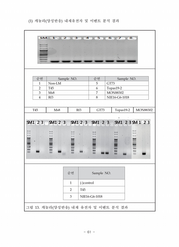 순번 Sample NO. 순번 Sample NO. 1 Non-LM 5 GT73 2 T45 6 Topas19-2 3 Ms8 7 MON88302 4 Rf3 8 NIE16-G6-1018 T45 Ms8 Rf3 GT73 Topas19-2 MON88302 순번 Sample NO. 1 control 2 T45 3 NIE16-G6-1018 그림 13. 캐놀라 양성반응 내재 유전자 및 이벤트 분석 결과 1 캐놀라 양성반응 내재유전자 및 이벤트 분석결과