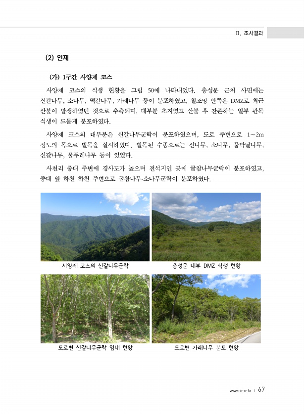 Ⅱ. 조사결과 www.nie.re.kr ? 67 사양제 코스의 신갈나무군락 충성문 내부 DMZ 식생 현황 도로변 신갈나무군락 임내 현황 도로변 가래나무 분포 현황 2 인제 가 1구간 사양제 코스 사양제 코스의 식생 현황을 그림 50에 나타내었다. 충성문 근처 사면에는 신갈나무, 소나무, 떡갈나무, 가래나무 등이 분포하였고, 철조망 안쪽은 DMZ로 최근 산불이 발생하였던 것으로 추측되며, 대부분 초지였고 산불 후 잔존하는 일부 관목 식생이 드물게 분포하였다. 사양제 코스의 대부분은 신갈나무군락이 분포하였으며, 도로 주변으로 1∼2m 정도의 폭으로 벌목을 실시하였다. 벌목된 수종으로는 신나무, 소나무, 물박달나무, 신갈나무, 물푸레나무 등이 있었다. 사천리 중대 주변에 경사도가 높으며 전석지인 곳에 굴참나무군락...