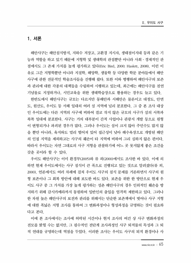 Ⅱ. 우이도 사구 www.nie.re.kr ? 65 1. 서론 해안사구는 해안침식방지, 지하수 저장고, 고환경 지시자, 생태점이지대 등과 같은 기 능과 역할을 하고 있기 때문에 지형학 및 생태학의 관점뿐만 아니라 사회·경제적인 관 점에서도 그 존재 가치를 높게 평가하고 있다 Eric Bird, 2000; Haslett, 2008 이런 이 유로 그간 지형학뿐만 아니라 지질학, 해양학, 생물학 등 다양한 학문 분야들에서 해안 사구에 관한 전문적인 학술조사들을 진행해 왔다. 또한 이와 병행하여 해안사구의 보존 과 관리에 대한 각종의 대책들을 수립하여 시행하고 있는데, 최근에는 해안사구를 천연 기념물로 지정하거나, 시민교육을 위한 생태학습장으로 활용하는 경우도 늘고 있다. 한반도에서 해안사구는 규모는 다르지만 동해...