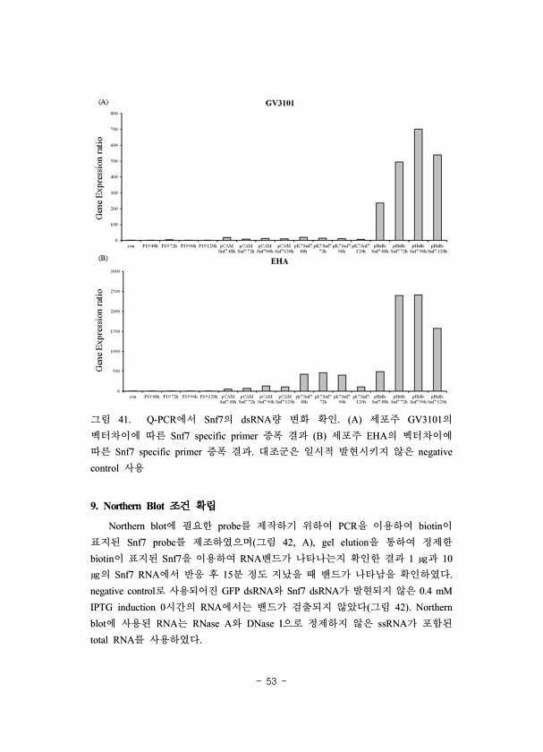 53 그림 41. Q-PCR에서 Snf7의 dsRNA량 변화 확인. A 세포주 GV3101의 벡터차이에 따른 Snf7 specific primer 증폭 결과 B 세포주 EHA의 벡터차이에 따른 Snf7 specific primer 증폭 결과. 대조군은 일시적 발현시키지 않은 negative control 사용 9. Northern Blot 조건 확립 Northern blot에 필요한 probe를 제작하기 위하여 PCR을 이용하여 biotin이 표지된 Snf7 probe를 제조하였으며 그림 42, A , gel elution을 통하여 정제한 biotin이 표지된 Snf7을 이용하여 RNA밴드가 나타나는지 확인한 결과 1 ㎍과 10 ㎍의 Snf7 RNA에서 반응 후 15분 정도 지났을 때 밴드가 나타남을 확인하...