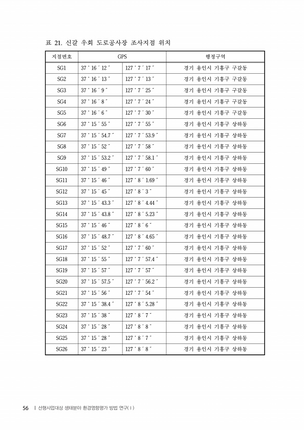지점번호 GPS 행정구역 SG1 37˚16´12˝ 127˚7´17˝ 경기 용인시 기흥구 구갈동 SG2 37˚16´13˝ 127˚7´13˝ 경기 용인시 기흥구 구갈동 SG3 37˚16´9˝ 127˚7´25˝ 경기 용인시 기흥구 구갈동 SG4 37˚16´8˝ 127˚7´24˝ 경기 용인시 기흥구 구갈동 SG5 37˚16´6˝ 127˚7´30˝ 경기 용인시 기흥구 구갈동 SG6 37˚15´55˝ 127˚7´55˝ 경기 용인시 기흥구 상하동 SG7 37˚15´54.7˝ 127˚7´53.9˝ 경기 용인시 기흥구 상하동 SG8 37˚15´52˝ 127˚7´58˝ 경기 용인시 기흥구 상하동 SG9 37˚15´53.2˝ 127˚7´58.1˝ 경기 용인시 기흥구 상하동 SG10 37˚15´49˝ 127˚7´60˝ 경기 용인...