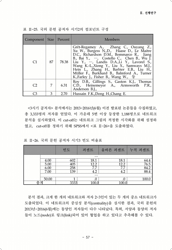 Ⅱ. 선행연구 57 Component Size Percent Members C1 87 78.38 Gr?t-Regamey A., Zhang C., Ouyang Z., Xu W., Burgess N.,D., Haase D., Le Maitre D.C., Richardson D.M., Bommarco R., Jiang B., Bai Y., …, Costello C., Chen B., Wu J. Liu Y., …, Landis D.A.,Li Y., Lavorel S., Wang K.-L.,Xiong Y., Liu X., Samways M.J., Hein L., Zhang H., Barbier E.B., Liu H., M?ller F., Burkhard B., Balmford A., Turner K.,Farley J...