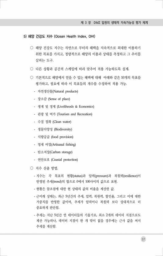 57 제 3 장 DMZ 일원의 생태적 지속가능성 평가 체계 5 해양 건강도 지수 Ocean Health Index, OHI ○ 해양 건강도 지수는 자연으로 부터의 해택을 지속적으로 최대한 이용하기 위한 목표를 가지고, 정량적으로 해양의 이용과 상태를 측정하고 그 추이를 살피는 도구. ○ 다른 상황과 공간적 스케일에 따라 맞추어 적용 가능하도록 설계. ○ 기본적으로 해양에서 얻을 수 있는 해택에 대해 아래와 같은 10개의 목표를 평가하고, 필요에 따라 이 목표들의 개수를 수정하여 적용 가능. 자연생산물 Natural products 장소감 Sense of place 생계 및 경제 Livelihoods & Economics 관광 및 여가 Tourism and Recreation 수질 정화 Clean water ...